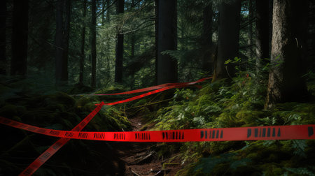 Nighttime urban scene with wet pavement reflecting city lights, yellow caution tape in foreground, and blurred figures creating a mysterious ambiance