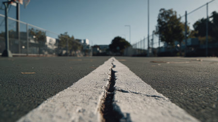 A close-up view of a cracked white line on a basketball court captures the essence of outdoor sports. The clear blue sky and distant trees enhance the scene of recreation.