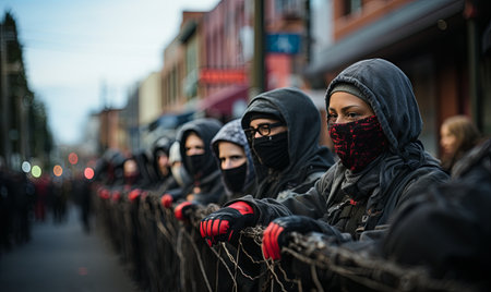 Group of individuals wearing face masks, standing outdoors on a city street.