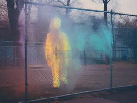Man in a coat stands still in a foggy area surrounded by blurred figures evoking a sense of isolation and contemplation during twilight.