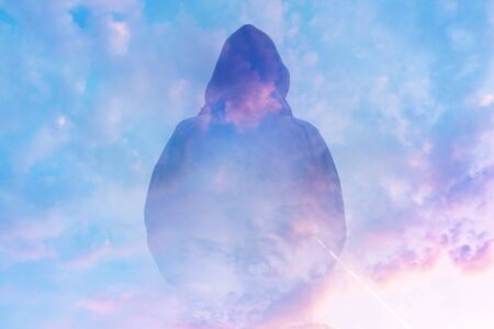 A double exposure of a moody, hooded figure silhouetted against the sunset. With an abstract, experimental dream like edit.