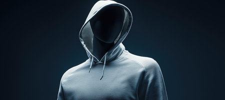An eerie figure in a hood symbolizing cyber threat and anonymity. Concept Hacker Theme, Cyber Threat Symbolism, Eerie Figure Pose