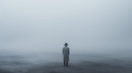 A person stands alone in dense fog, reflecting on lives challenges while looking for a path forward in a silent, unclear landscape.