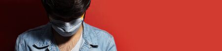 Close-up portrait of young man in denim jacket wearing grey medical face mask against coronavirus. Isolated on red panorama banner background with copy space.