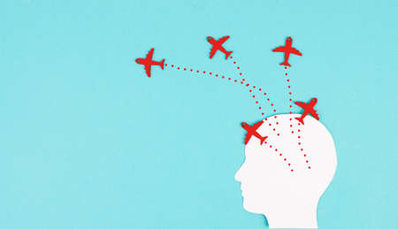 Silhouette of a head with red airplanes flying in different directions, having a vision for the future, idea for a new business, thinking outside the box, being open minded