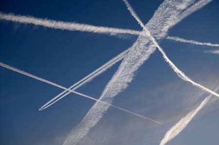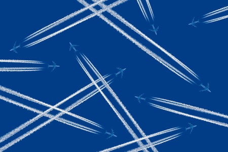 Heavy traffic: airliners criss-crossing the blue sky.