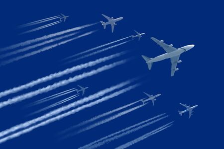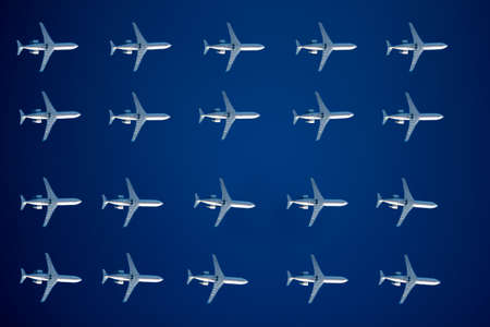 top view of a group of passenger planes on a blue background. Passenger transportation. The airline. International and commercial flights.