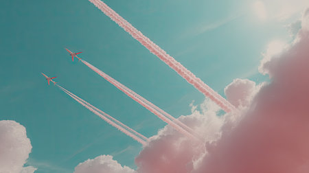 Three airplanes traverse a sky filled with fluffy clouds and vapor trails. The scene showcases a vivid contrast between the bright blue sky and the pinkish clouds. This image displays an artistic composition, possibly suitable for commercial and editorial applications to represent travel or aviation.