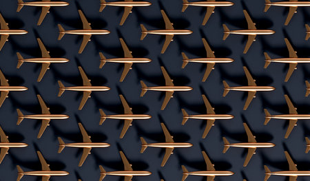 Pattern made of model airplane on yellow background. Travel vacation summer concept. Top view, flat lay. Airlines out of service concept. Out of business airliners.
