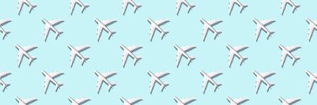 Creative banner of white planes on blue background. Travel, vacation concept. Travel, vacation ban. Flights cancelled and resumed again. Top view. Flat lay. Minimal style design. Summer pattern