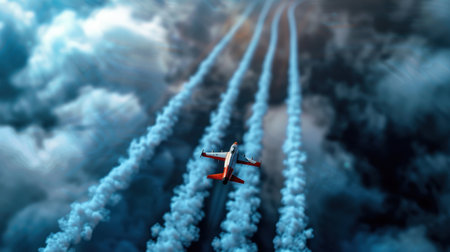 A stunning depiction of an airplane soaring through the vast sky, leaving behind striking contrails amid dark, dramatic clouds, capturing the essence of travel and adventure.