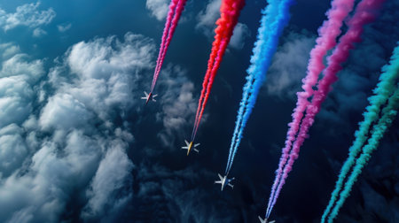 This captivating image captures multiple airplanes creating vibrant smoke trails against a blue sky. The colorful display adds a dramatic flair to the scene.