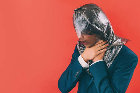 The man covers his face with a polyethylene bag.