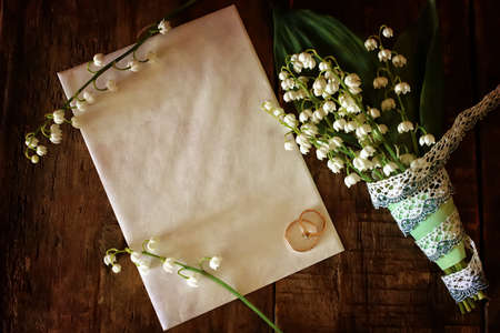 wedding rings on white envelope near bouquet of flowers on textured surface