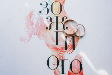 Close up Two beautiful stylish gold narrow wedding rings of the bride and groom on designer white paper with pink pictures and black letters. Wedding accessories, jewelry.