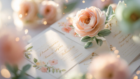 Elegant floral wedding invitations with peach roses on a soft background in a serene setting