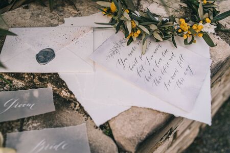 Wedding calligraphy and decor. Wedding invitations, envelope, lace, cards