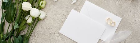panoramic shot of wedding rings on blank invitation card, white cheesecloth and flowers on textured surface