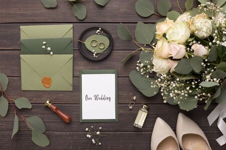 Wedding flat lay. Bridal bouquet of roses, shoes and rings, other wedding accessories on wooden background
