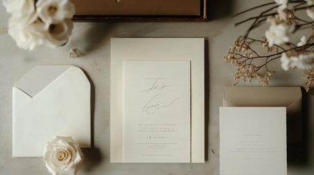 Elegant Wedding Invitation Suite With Floral Accents on Neutral Background