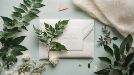 wedding invitation in a gray envelope on a table with green sprigs