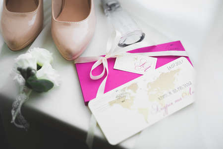 Wedding invitations. Wedding details of the bride. Bridal bouquet and other accessories. Shoes of the bride