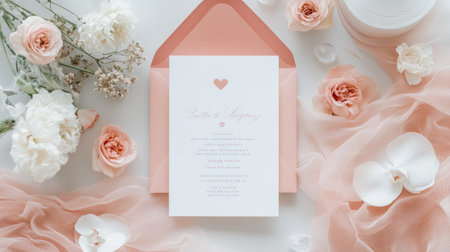 Soft pink background features an invitation envelope adorned with a ring and decorative flower accents, along with delicate roses and baby's breath, creating a romantic atmosphere.