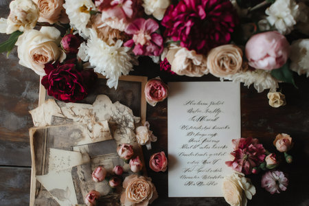 A vintage-inspired invitation card with calligraphy, surrounded by soft flowers, perfect for a romantic wedding theme
