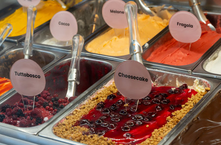 Colorful gelato selection displayed in a local dessert shop during summer in an urban area