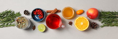 Assortment of juices and lemonades with fruits and herbs on wooden table