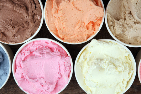 Variety of ice cream flavors. Variety of delicious ice cream on the store counter. Food