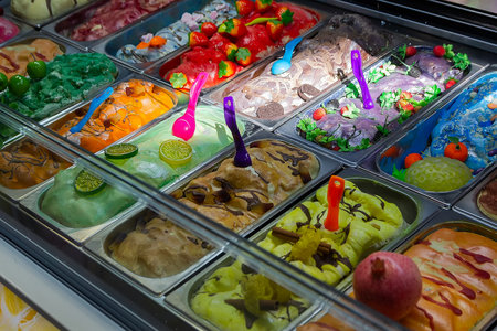 Close-up of ice cream with different flavors in the refrigerator on a shop window