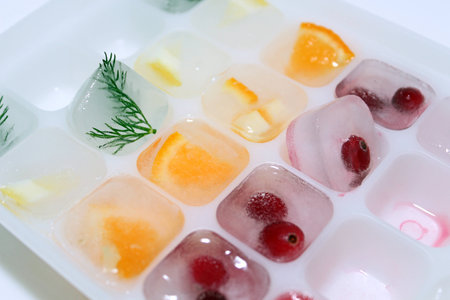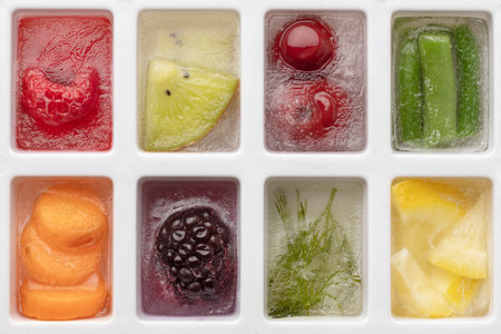 Ice cubes with fruits and berries in tray near ingredients on light table