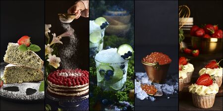 Restaurant desserts assortment. Collage of delicious chocolate and berry cakes and sweets