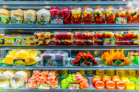 SINGAPORE - MAR 3, 2020: Packages with fresh fruits displayed in a commercial refrigerator