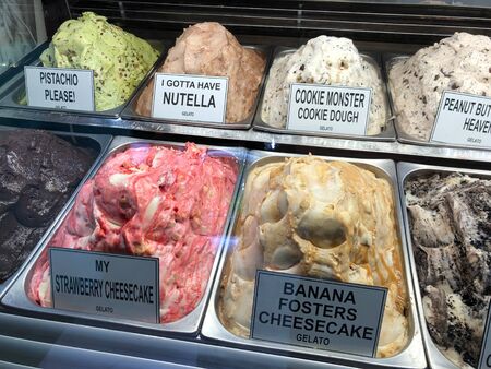 Display window in a store or ice cream parlour of assorted ice cream flavors for sale as summer takeaways displayed in metal trays. High quality photo
