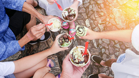 Hand shake with the icecream in the cup for outdoor activity picture.