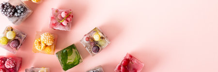 Frozen ice cubes with various fruits banner, blackberries and raspberries, gooseberries and currants, blueberries and mint, top view