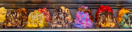 Colorful Gelato Display. Rainbow colored ice cream scoops with chocolate and toppings in a refrigerated showcase. Concept of indulgence, flavor variety, summer sweet temptation