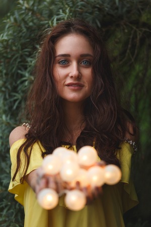 Young woman weekend at home decorated bedroom holding lights