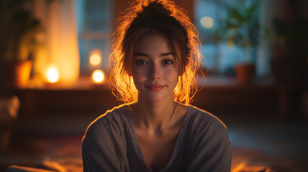 A young woman sits serenely in candlelight in a cozy room, exuding warmth and tranquility during a quiet evening indoors