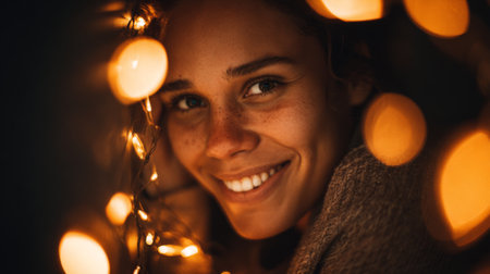 A warm and intimate portrait of a woman smiling gently, illuminated by twinkling fairy lights. The scene captures joy and serenity, enhancing the cozy atmosphere.