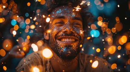 A smiling man in a festive hat looks up in wonder, surrounded by colorful bokeh lights and confetti.
