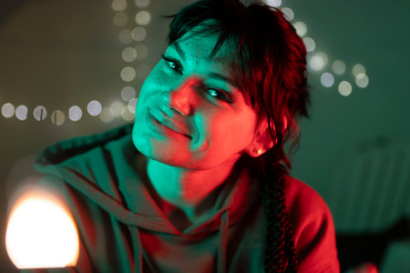 Young woman smiling with vibrant colorful studio lights