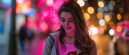Stunning Smiley Woman Using Smartphone While Walking Through Night Street With Neon Lights. A portrait of a gorgeous smiling woman using a smartphone in the night.