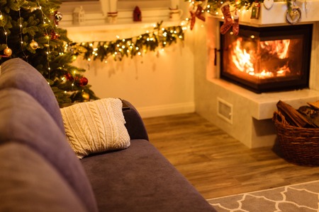 The interior of the Scandinavian-style living room, decorated for the Christmas holidays. Christmas tree next to the fireplace.