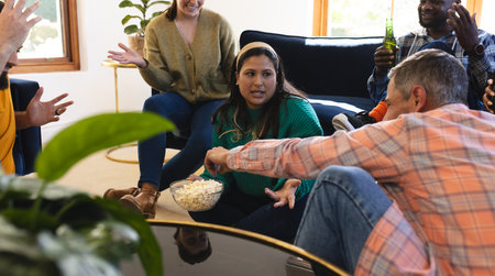 Happy diverse male and female friends talking, drinking beer and eating popcorn at home. Lifestyle, friendship, relaxation, free time and domestic life, unaltered.