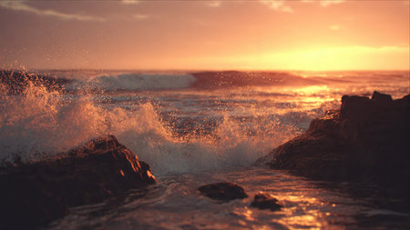 Beautiful sunset on the sea with waves breaking on the rocks.