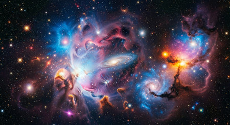 Explore the captivating beauty of a vibrant cosmic nebula filled with colors and twinkling stars, representing the majestic wonders of the universe and celestial phenomena.