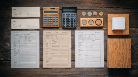 A flat lay composition featuring financial documents, a calculator, coins, and wooden accessories, ideal for depicting business and finance themes in a professional context.